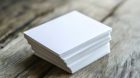 A stack of blank papers on a wooden table. perfect for adding your own text or design. Ideal for presentations. reports. and more!