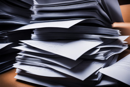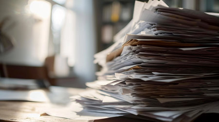 Large file stack on desk, paperwork heap in business office generated by artificial intelligence