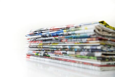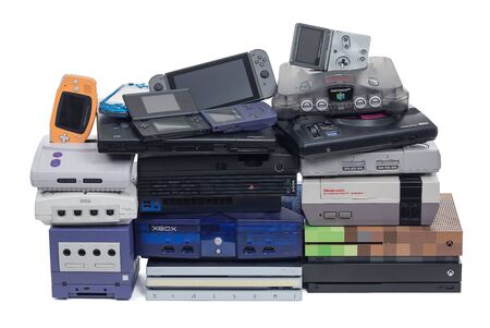 Taipei, Taiwan - September 9, 2019: A large pile of video game systems isolated on white.