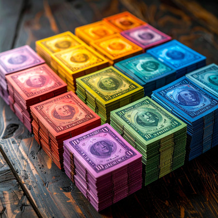 On a rustic wooden table, stacks of currency glow in every color of the rainbow.