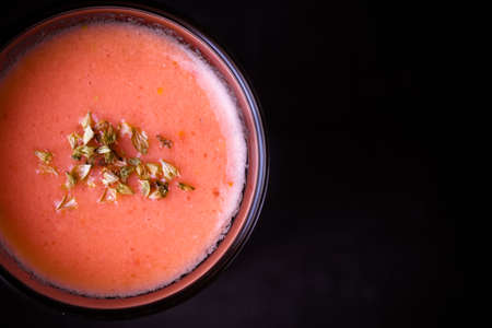 Gazpacho with croutons and basil on dark background