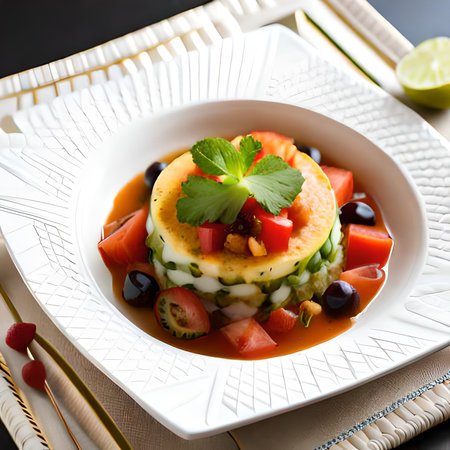 stacked gazpacho tower, with each serving topped with a different garnish, created with generative ai