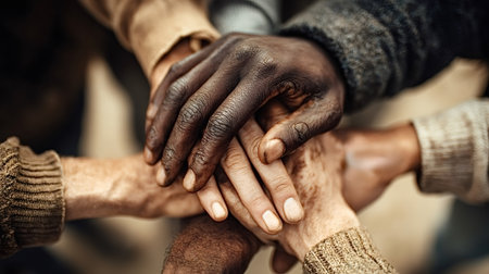 Unity through hands a diverse group of hands, both light and dark, stacked together in a powerful display of solidarity and connection. This image beautifully captures the essence of teamwork and friendship, showcasing the strength found in diversity and collaboration