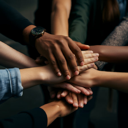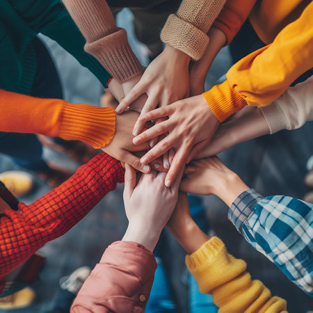 A close up overhead shot captures a stack of diverse hands with varying skin tones interlocked together symbolizing unity support and teamwork among people.