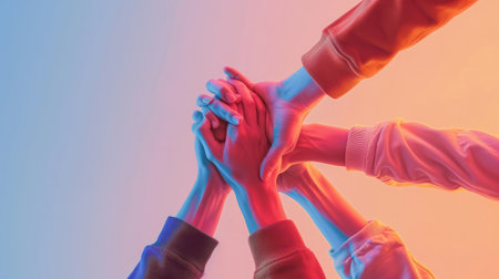 A diverse group of people with different ethnicities and skin colors join hands in unity and solidarity, showing support for common goals and values.