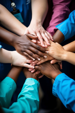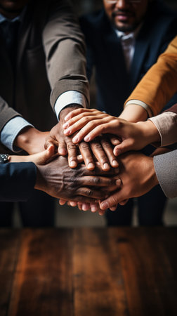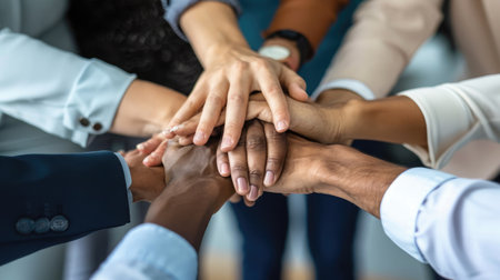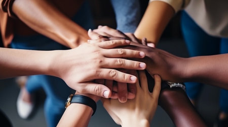 Diverse hands are stacking on top of each other, symbolizing unity, solidarity, support, and cooperation among different people working together as a team