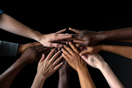Close-up top view of a diverse group of people with different skin tones holding hands in a circle on a black background. Symbol of unity, equality, and global togetherness.