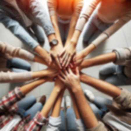 A group of people are forming a circle by putting their hands together, showing unity and collaboration
