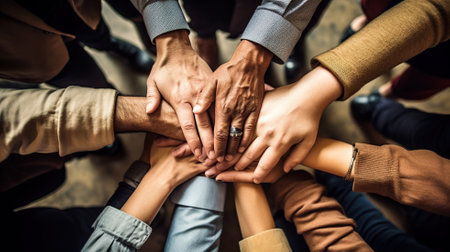 Multiracial hands joined together in a circle symbolizing unity, diversity and collaboration. Generative AI