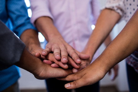 business team showing unity with putting their hands together. Close-Up of hands on top of each other