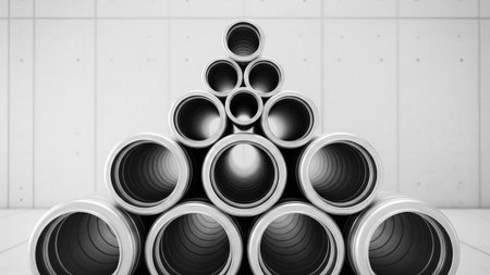 A minimalist composition a stack of industrial metal pipes arranged in a precise pyramid formation. The circular openings of the pipes are clearly visible, creating a strong geometric pattern. The metallic silver surfaces contrast with the neutral gray concrete wall in the background. highlights the clean lines and repetitive nature of industrial themes related to construction, engineering, or manufacturing.
