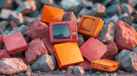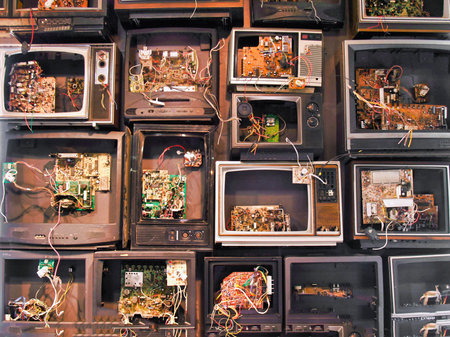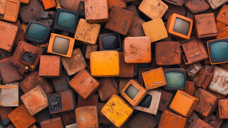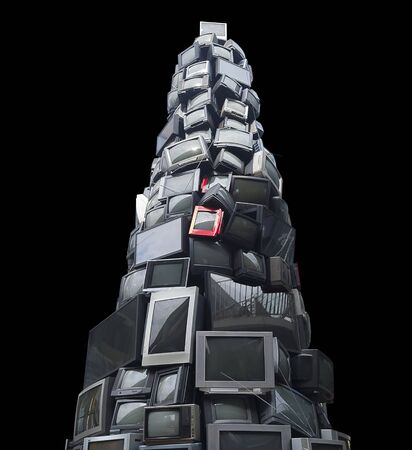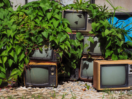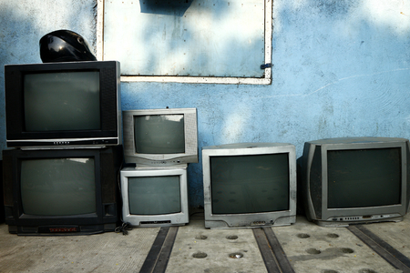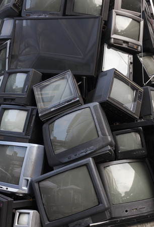 old television garbage, rubbish TV, electronic junk can be recycle. Pile of Obsolete or broken television stacked for disposal, Stacked Recycling Electronics. any logos and brand names have been removed. Great for recycle and environmental themes.