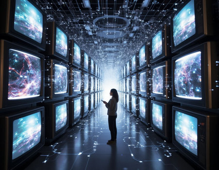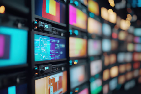 Numerous screens illuminate a tech workspace, each displaying unique colorful graphics and patterns.