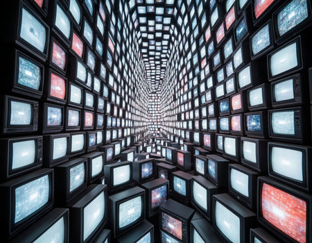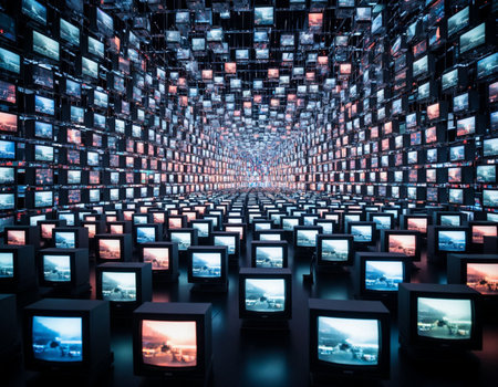 illustration of a dark and illuminated room full of old CRT televisions with green screens. The room is filled with the glow of the screens, creating an eerie atmosphere.