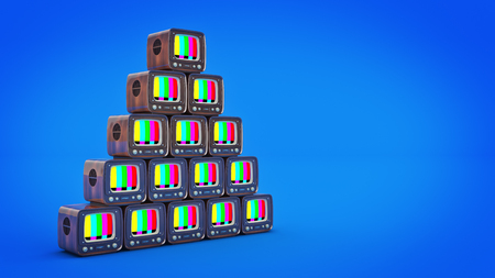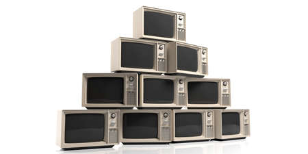 Pile of color retro TV. Antique television sets background. 3D rendering illustration