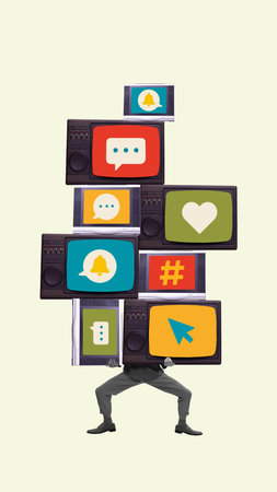 Overwhelmed figure collapsing under chaotic stack of media screens