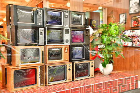 A lot of colorful old television decorate in coffee shop vintage tone.