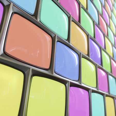 Huge array of retro televisions showing bright blocks of uniform colors. This image is a 3d render.