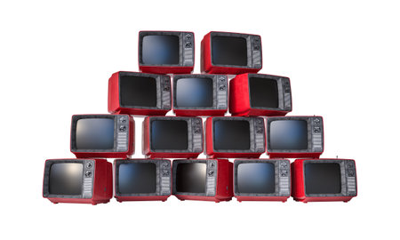A collection of old televisions stacked together, showing various shapes and colors, evoking nostalgia.