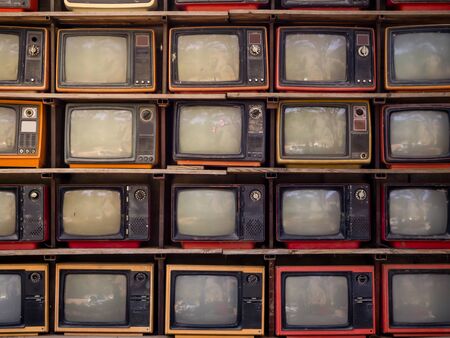 Many retro television. vintage old TV is colorful multi-row. Seeing the past. Pattern wall of old Antique television (TV). television concept. media.