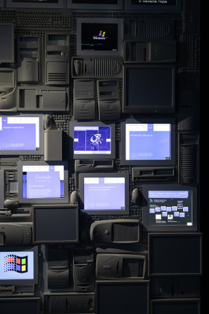 Moscow, Russia - January 16, 2024: information wall made from old monitors and computers in Museum of Cryptography in Moscow