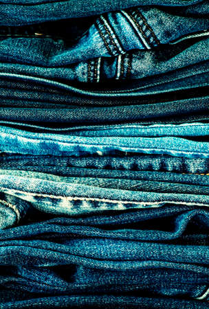 Denim background, some jeans trousers on the table, selective focus