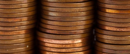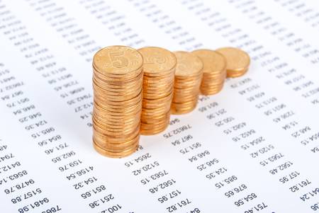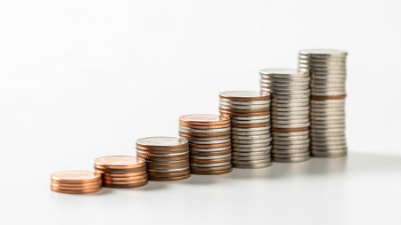 Business/ showing increasing stacks of copper and silver coins arranged in a staircase pattern on a white background...