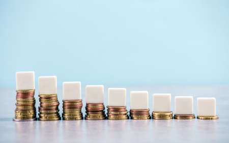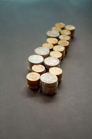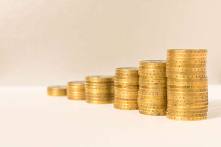 Stacks of coins in a growing progression. Background with copy space for text or inscriptions. Business economic development concept