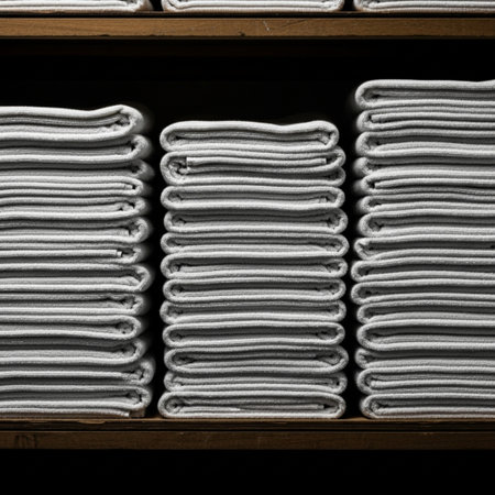 Stack of white towels on a shelf in a warehouse. Selective focus.