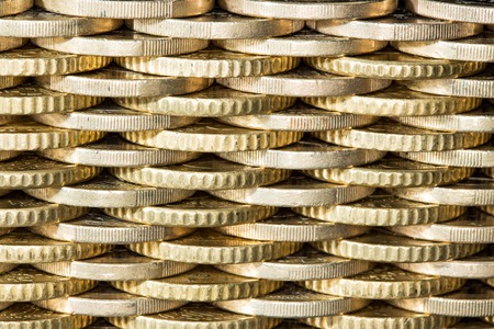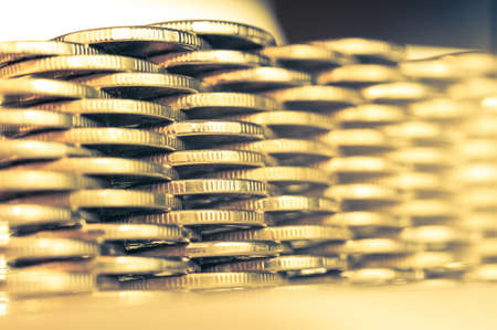 Stack of coins macro. Rows of coins for finance and banking concept. Economy trends background.