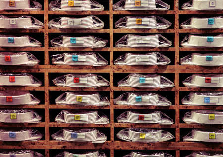 Colorful bright rolls of a paper arranged in a row