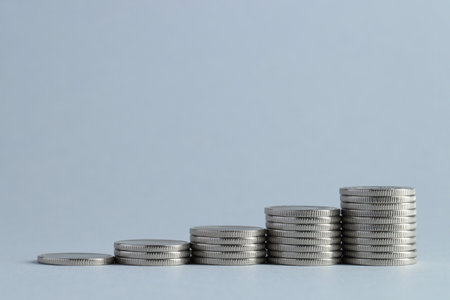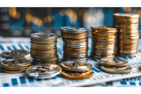 Stacks of coins arranged in ascending order symbolize financial growth and investment. shiny metal surfaces reflect light, creating visually appealing contrast against dark background