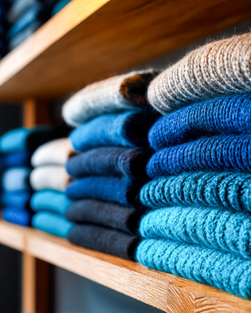 Vibrant knitted jumpers are carefully arranged in uniform stacks on rustic wooden shelves, creating a cozy, inviting atmosphere in a boutique clothing