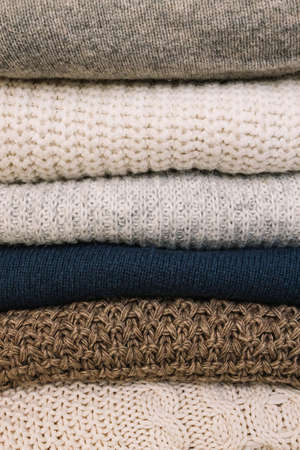 Close Up image of stack of some knitted sweaters. Macrophotography. Autumn and winter clothes. Cozy knitted sweater background.