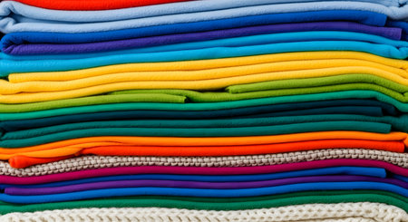 Stack of colorful folded textiles. Rainbow apparel pile. Vibrant fabric textures. Neatly arranged clothes for organization. Diverse clothing colors.