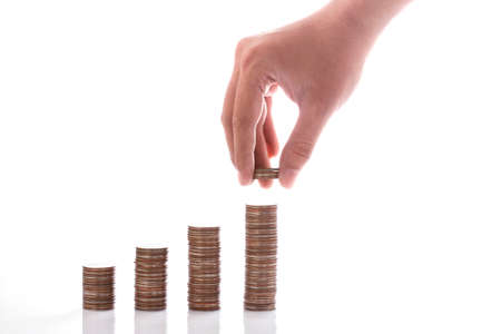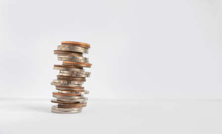 Stack coin on white background with free space. Growth Pile cash money stock market in bank. currency exchange, value salary, saving treasure investment, credit, business or finance concept.