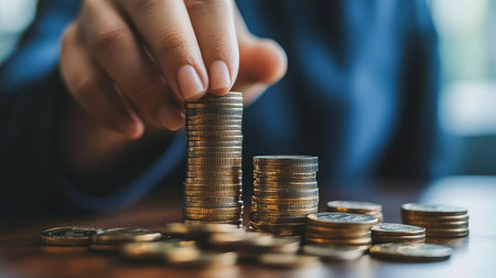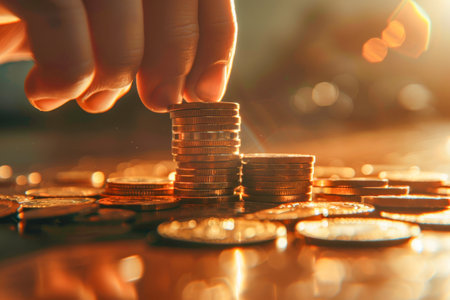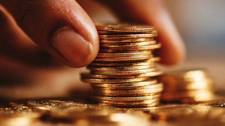 Stack of shiny gold coins being carefully arranged by hand, symbolizing wealth and prosperity. warm lighting enhances richness of coins, creating inviting atmosphere