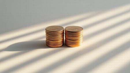 Stacked gold coins on a plain surface with dramatic shadow lines. Financial growth and savings concept