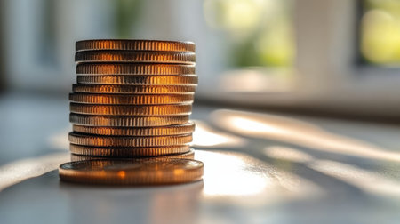 A stacked coins illuminated by dramatic lighting create striking visual effect, showcasing texture and shine of metal. this close up captures essence of wealth and finance