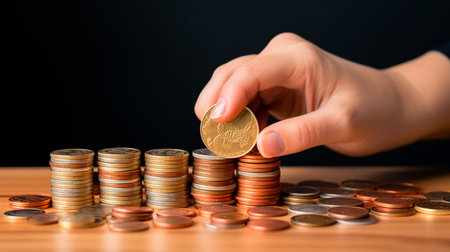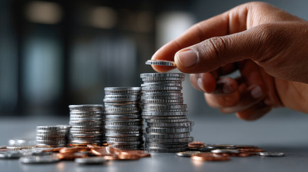 A detailed close-up captures a hand carefully placing a coin atop a neatly organized stack of coins, symbolizing finance and wealth management.