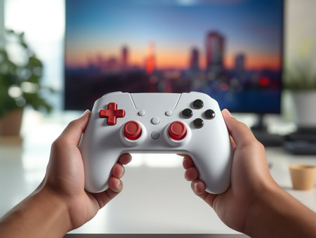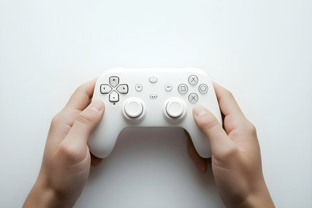 Hands holding a white gaming controller against a minimalistic background, symbolizing modern gaming and technology. Close-up