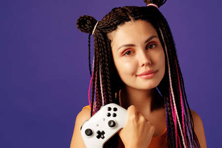 SAINT-PETERSBURG, RUSSIA - APRIL 13, 2018: White joystick xbox one s gamepad, game console on purple pastel background. Computer gaming competition videogame control concept