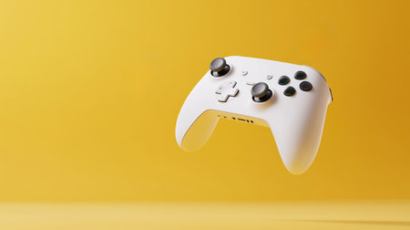 A gaming-themed design featuring a black game controller placed on a vibrant yellow backdrop.