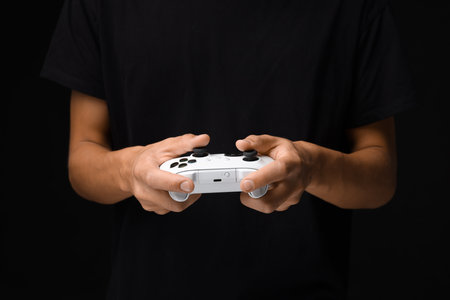 Sony Playstation 4 game joysticks in hand on black background with copy space. High quality photo
