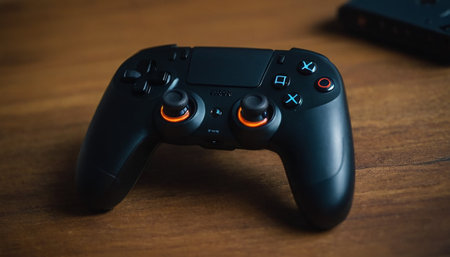 A sleek black gaming controller rests on a polished wooden table, bathed in soft sunlight that creates gentle shadows, evoking a cozy gaming atmosphere.
