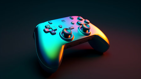 Realistic video game controller in neon lights on black noir background. 3D rendering of streaming gear and virtual reality concept