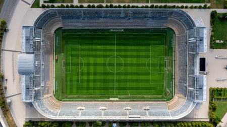 The aerial view captures an empty soccer field in a stadium, showing the layout of the pitch, goalposts, and surrounding stadium seats. The neatly trimmed grass contrasts with the marked lines of play, illustrating the designated areas for gameplay.