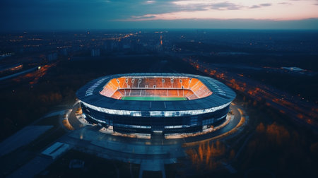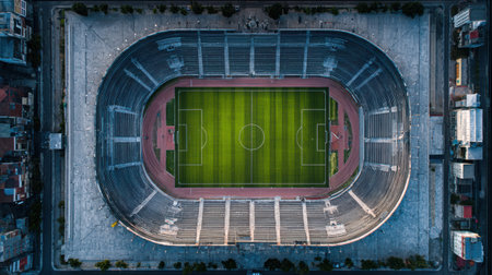 Stunning aerial view of a modern stadium featuring a vibrant green soccer field and empty stands during sunset in an urban setting. Ideal for sports themes.