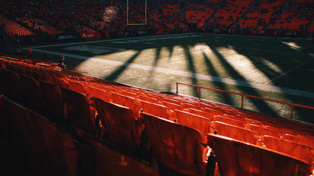 A captivating image of empty stadium seats illuminated by sunlight, creating striking shadows and vibrant colors, evoking the thrill of a football game day atmosphere.