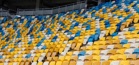 Blue and yellow plastic seats in a stadium, detail of a sports arena